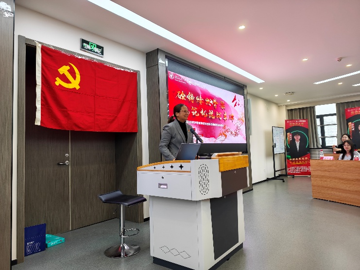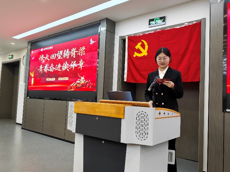 本科生第四党支部王福一唱以“抗战烽烟铸铁血,自立自强启新程”为主题,带领参会师生回顾抗战背景、历程与胜利意义,阐释抗战精神内涵,结合国家发展成就,号召新时代青年传承抗战精神、担当强国使命。