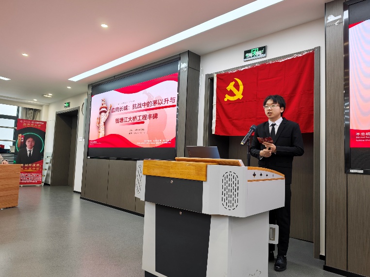 铁道2403班习近平新时代中国特色社会主义思想学习小组李甲同学以“血肉长城:抗战中的茅以升与钱塘江大桥工程丰碑”为主题,讲述了抗战时期茅以升领衔建成钱塘江大桥,通车89天后为阻敌自毁,彰显土木人的科技报国精神。